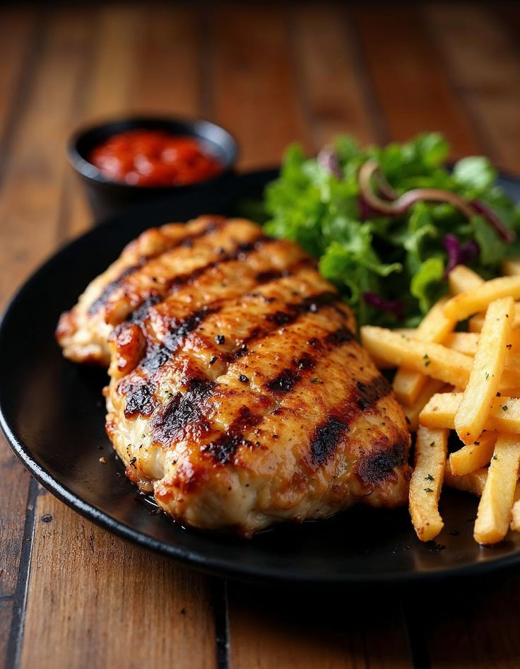 Son 400 grs de Filete de pollo a la parrilla acompañada de papas grilladas , choclo , chorizo argentino y ensalada fresca claro acompañado de su rico chimichurri y ají parrillero